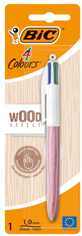 Con cuerpo cubierto con un atractivo diseño de aspecto natural (color madera natural, madera azul marino, madera verde oscuro y madera rosa), este bolígrafo BIC 4 Colours Wood Style es una versión lúdica y actual del icónico BIC 4 Colores. Las cuatro puntas medias de 1,0 mm de este bolígrafo multiusos se adaptan perfectamente a todo tipo de usos. Sus recambios de tinta de cuatro colores (azul, rojo, verde y negro) hacen que organizar y memorizar notas sea mucho más sencillo. Fabricados en Francia y diseñados para durar, cada uno de estos bolígrafos escribe una media de 8 km.